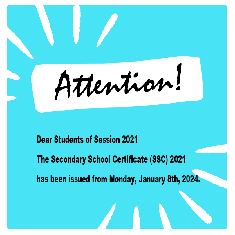 Dear Students of Session 2021 The Secondary School Certificate (SSC) 2021 has been issued from Monday, January 8th, 2024. Post navigation WINTER VACATION NOTICETIMINGS DURING WINTER