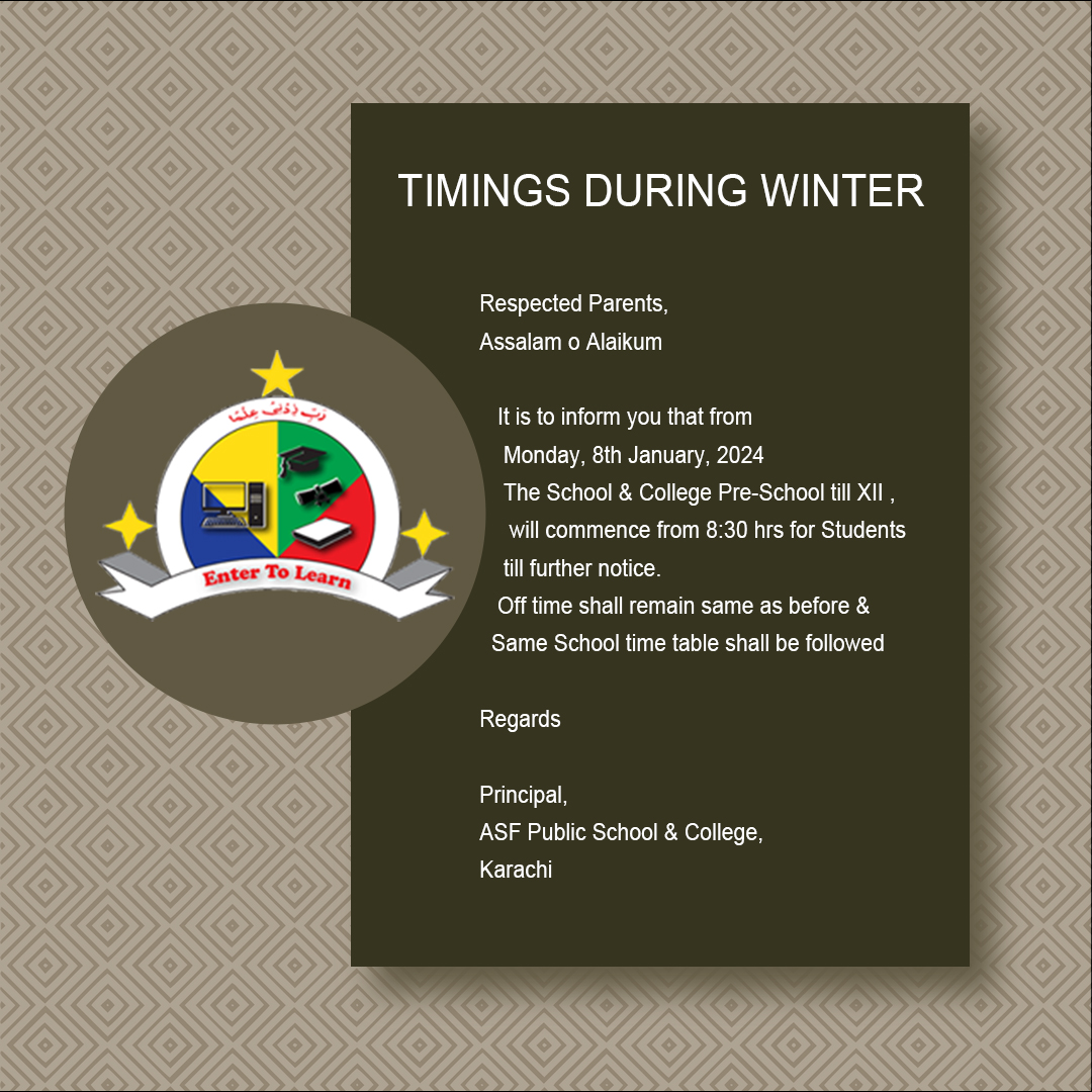 It is to inform you that from Monday , 8th January, 2024 The School & College Pre-School till XII , will commence from 8:30 hrs for Students till further notice.